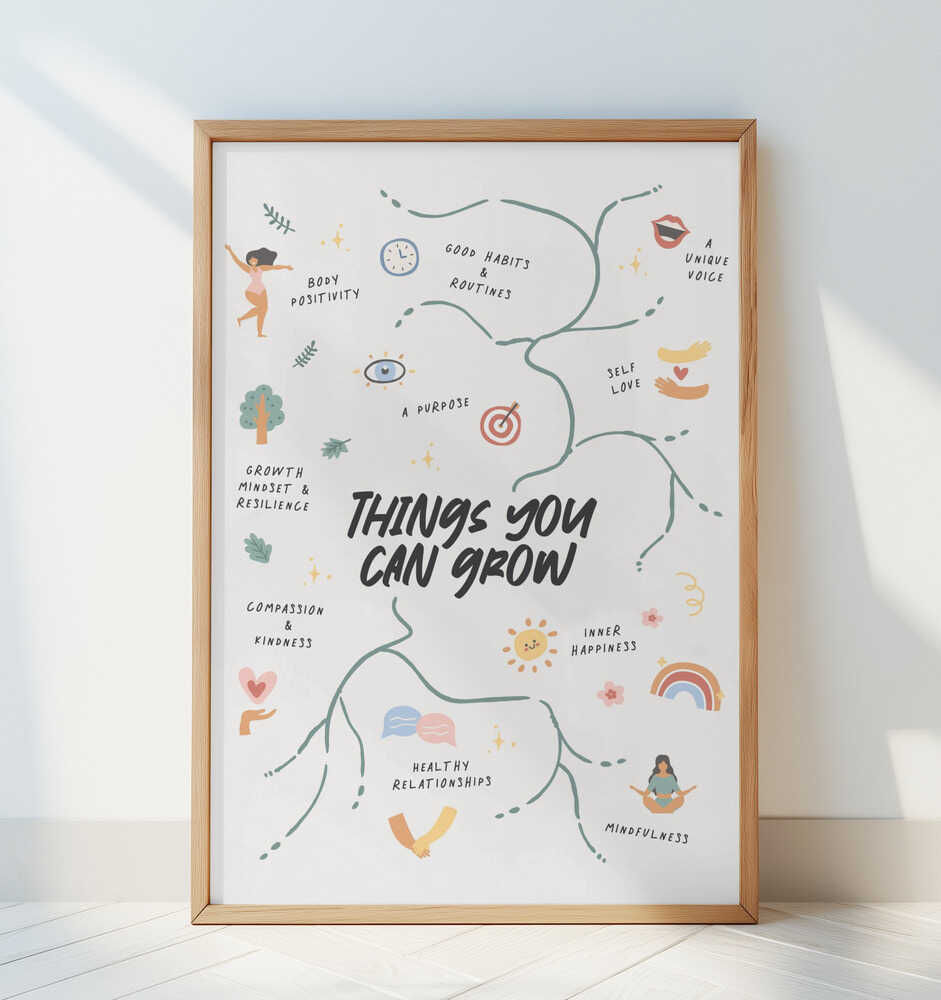 Verschönern Sie Ihren Tag und fördern Sie persönliches Wachstum mit diesem verspielten und nachdenklichen Wandbild, das Sie daran erinnert, all die wunderbaren Dinge in sich selbst zu pflegen. Von Selbstvertrauen und Geduld bis hin zu Liebe, Freude und Selbstfürsorge – jedes illustrierte Element bringt Wärme und Positivität in Ihren Raum. Die sanften Pastelltöne und handgezeichneten Symbole schaffen eine beruhigende und zugleich inspirierende Atmosphäre, ideal für Schlafzimmer, Arbeitszimmer oder kreative Ecken. Eine liebevolle tägliche Erinnerung daran, dass Wachstum viele Formen annehmen kann. Gedruckt auf mattem Papier in Museumsqualität, behält es seinen Charme und seine Botschaft über Jahre hinweg.