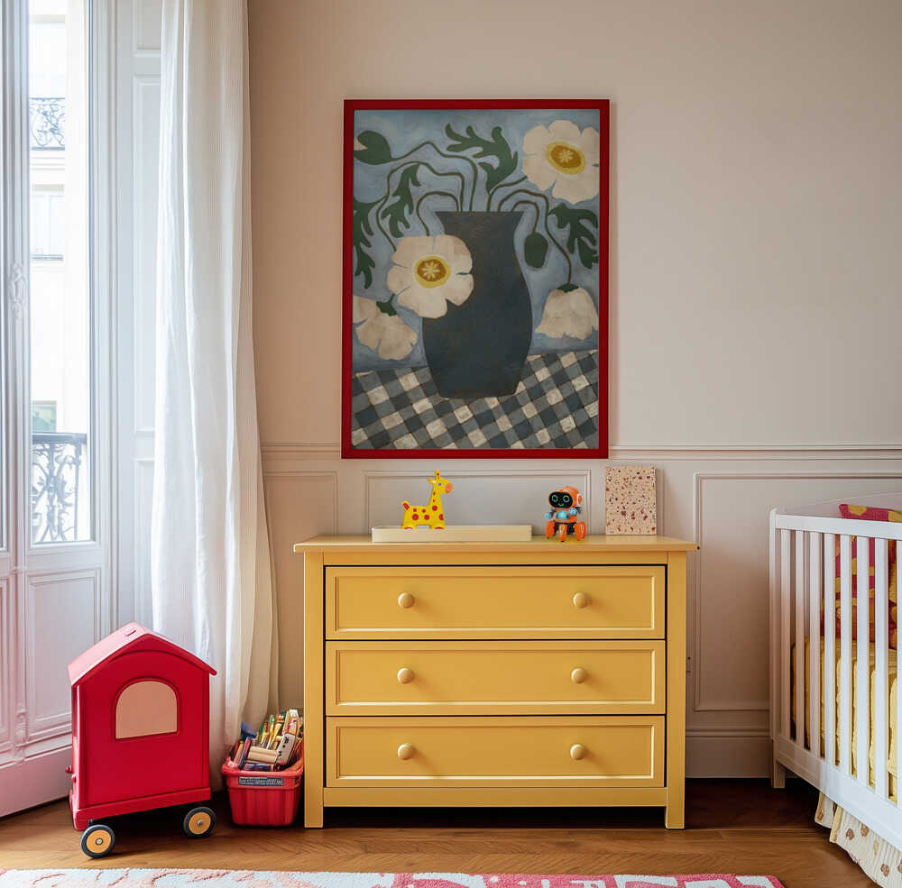 Verleihe deiner Einrichtung einen Hauch von Vintage-Charme mit dieser ausdrucksstarken Wandkunst, die eine tiefblaue Vase voller zarter weißer Blumen vor einem gedämpften blauen Hintergrund und einem karierten Tischtuch zeigt. Das minimalistische Design und die harmonische Farbpalette schaffen eine ruhige Atmosphäre, ohne den Raum zu überladen. Zeitlos und zugleich verspielt gestaltet, passt sie wunderbar über das Babybett, in die Leseecke oder an den Schreibtisch. Eine stilvolle Wahl fürs Kinderzimmer, Wohnzimmer oder moderne Familienräume – perfekt kombinierbar mit skandinavischem Einrichtungsstil und Galeriewänden. Gedruckt auf mattem Papier in Museumsqualität, das Farben und Details über Jahre hinweg bewahrt.